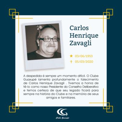 É com pesar que o Clube Guaxupé comunica o falecimento do sócio Carlos Henrique Zavagli. Caloi, como era conhecido, foi um associado que participou efetivamente em vários fatos do nosso Clube. Foi presidente do Conselho Deliberativo na gestão 2017/2018.