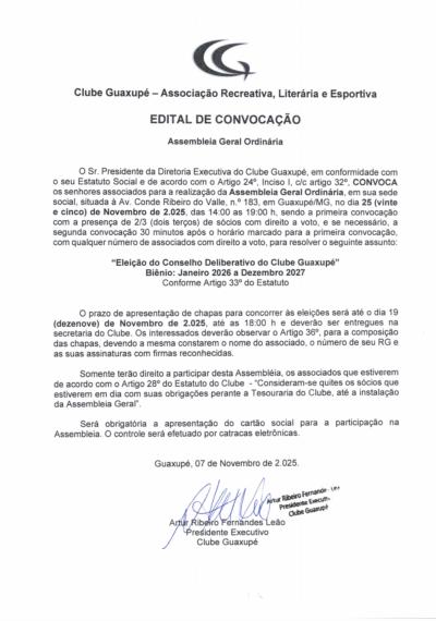 O Sr. Presidente da Diretoria Executiva do Clube Guaxupé, em conformidade com o seu Estatuto Social e de acordo com o Artigo 24º, inciso I, c/c artigo 32º, CONVOCA os senhores associados para a realização da Assembleia Geral Ordinária, em sua sede social, situada à Av. Conde Ribeiro do Valle, n.º 183, em Guaxupé/MG, no dia 25 (Vinte e cinco) de Novembro de 2.025, das 14:00 às 19:00 h, sendo a primeira convocação com a presença de 2/3 (dois terços) de sócios com direito a voto, e se necessário, a segunda convocação 30 minutos após o horário marcado para a primeira convocação, com qualquer número de associados com direito a voto.