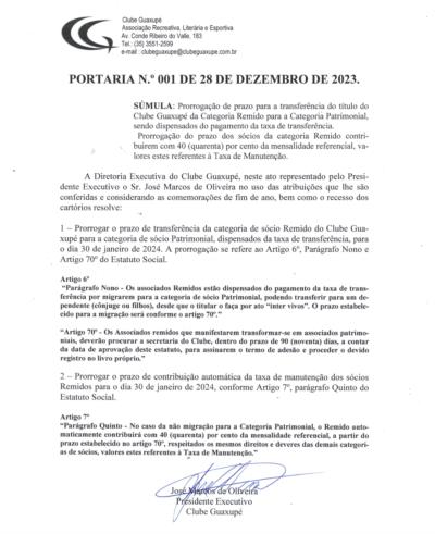 1 - Prorrogar o prazo de transferência da categoria de sócio Remido do Clube Guaxupé para a categoria de sócio Patrimonial, dispensados da taxa de transferência, para o dia 30 de janeiro de 2024. A prorrogação se refere ao Artigo 6º, Parágrafo Nono e Artigo 70º do Estatuto Social.