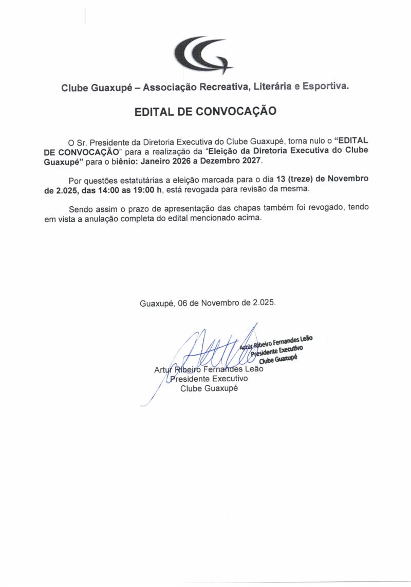 O Sr. Presidente da Diretoria Executiva do Clube Guaxupé, torna nulo o "EDITAL DE CONVOCAÇÃO" para a realização da "Eleição da Diretoria Executiva do Clube Guaxupé" para o biênio: Janeiro 2026 a Dezembro 2027.